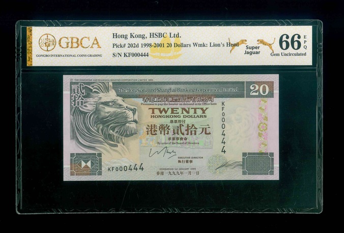 1999 香港上海滙豐銀行 $20 GBCA 66 EPQ 編號:KF000444(雙豹號,頂級雪白)