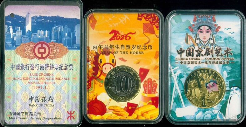 1994/2023/2026 中國京劇藝術紀念 $5/ 馬年生肖 $10/ 地鐵公司中銀紀念票 品相如圖 編號:NIL(共2枚1張)