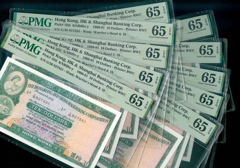 1980 香港上海滙豐銀行 $10 PMG 65 EPQ 編號:G/36 827551-60(十連號,含豹子,頂級雪白)