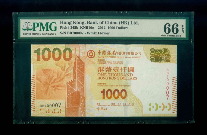 2012 香港中國銀行 $1000 PMG 66 EPQ 編號:BB700007(雙冠雷達號,頂級雪白)