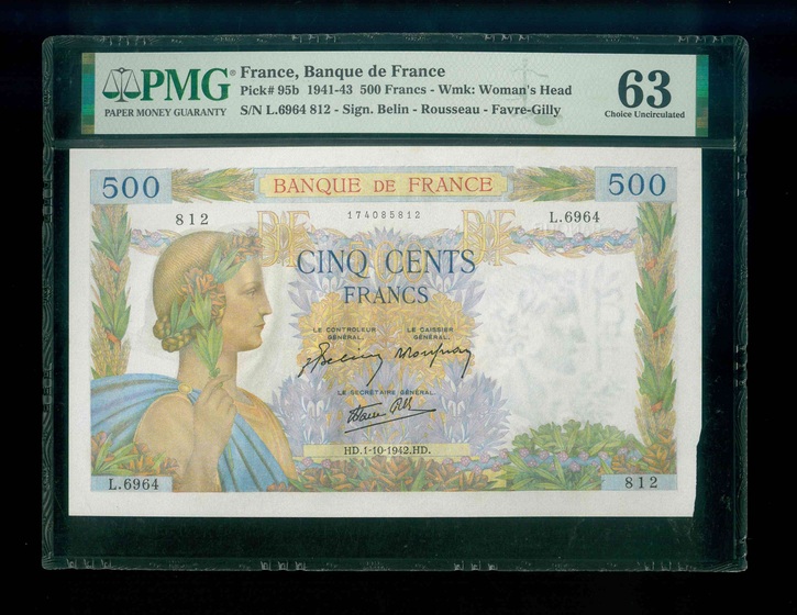 1942 法國 500Fr PMG 63 編號:L.6964 812(Edge Damage)
