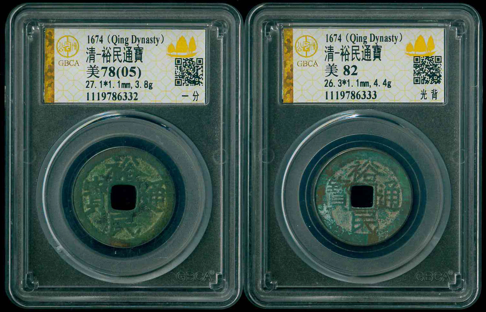 1674 清代 裕民通寶-光背/一分 GBCA 美80/美82, 共2枚