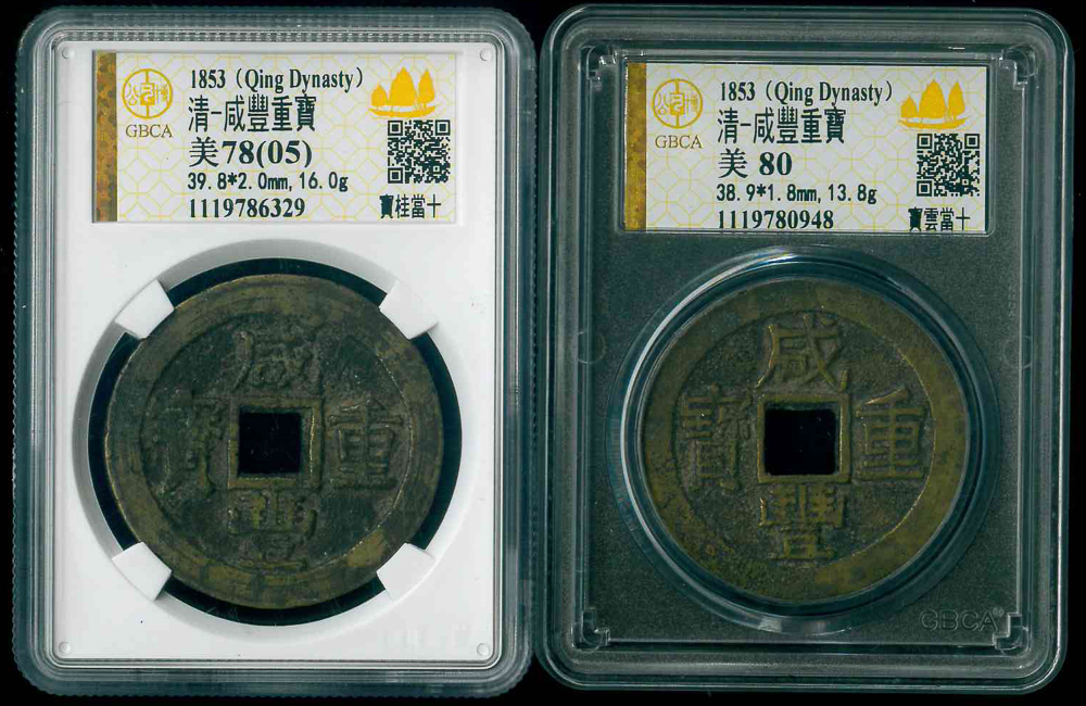 1853 清代 咸豐重寶-寶雲/寶桂當十 GBCA 美78(05)/ 美80, 共2枚)