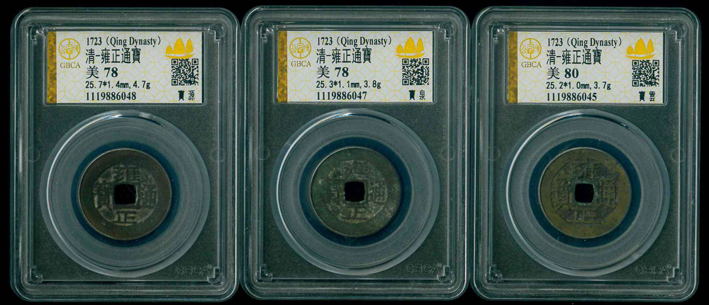 1723 清代 雍正通寶-寶雲/ 寶泉/ 寶源 GBCA 美78/ 美80, 共3枚