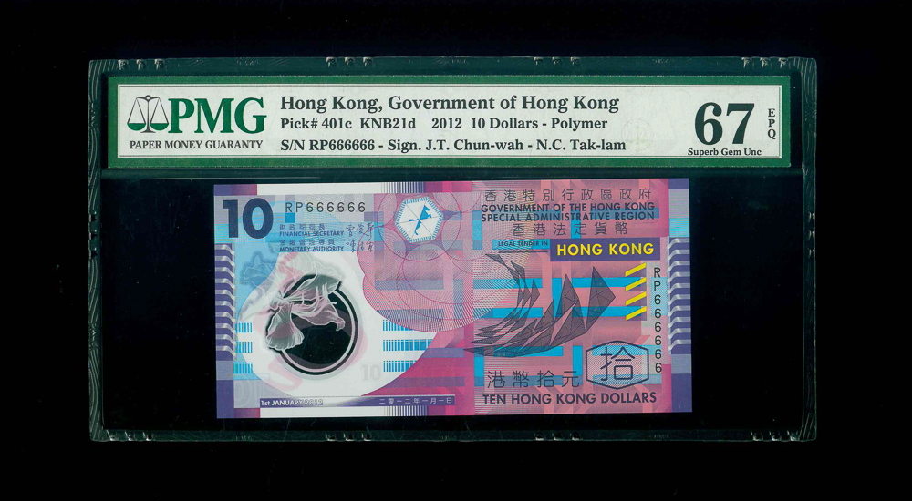 2012 香港政府$10 PMG 67 EPQ 編號: RP666666, 全6