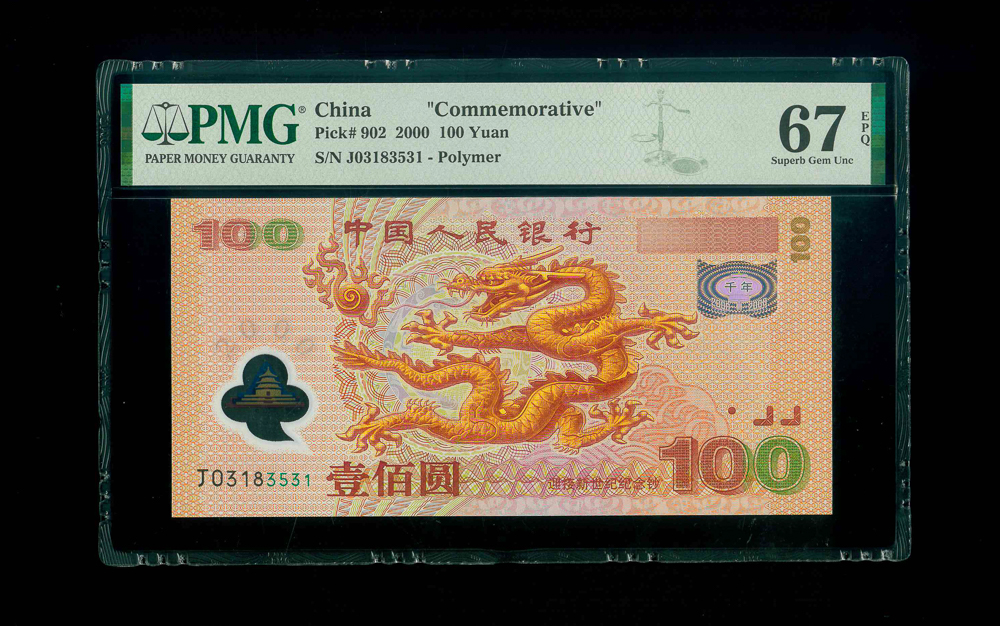 2000 中國人民銀行-迎接新世紀紀念鈔$100 PMG 67 EPQ 編號: J03183531, 無4,7