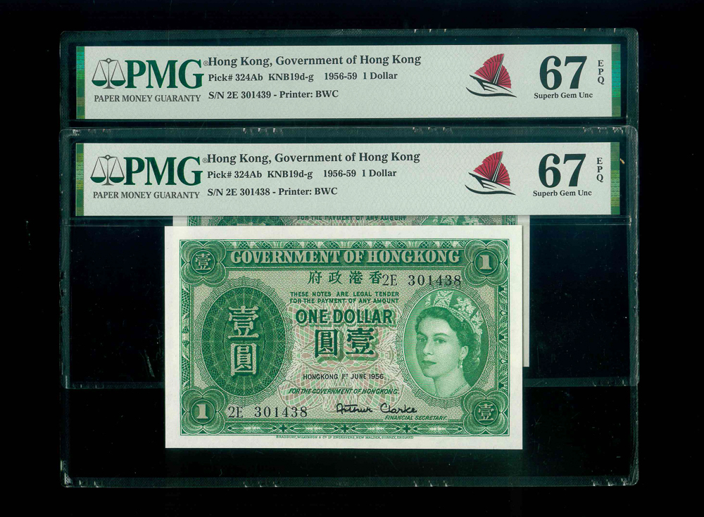 1956 香港政府$1 PMG 67 EPQ 編號: 2E 301438-439, 連號, 共2張