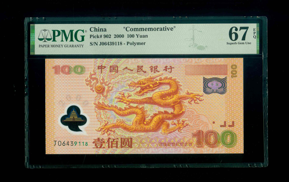 2000 中國人民銀行-迎接新世紀紀念鈔$100 PMG 67 EPQ 編號: J06439118
