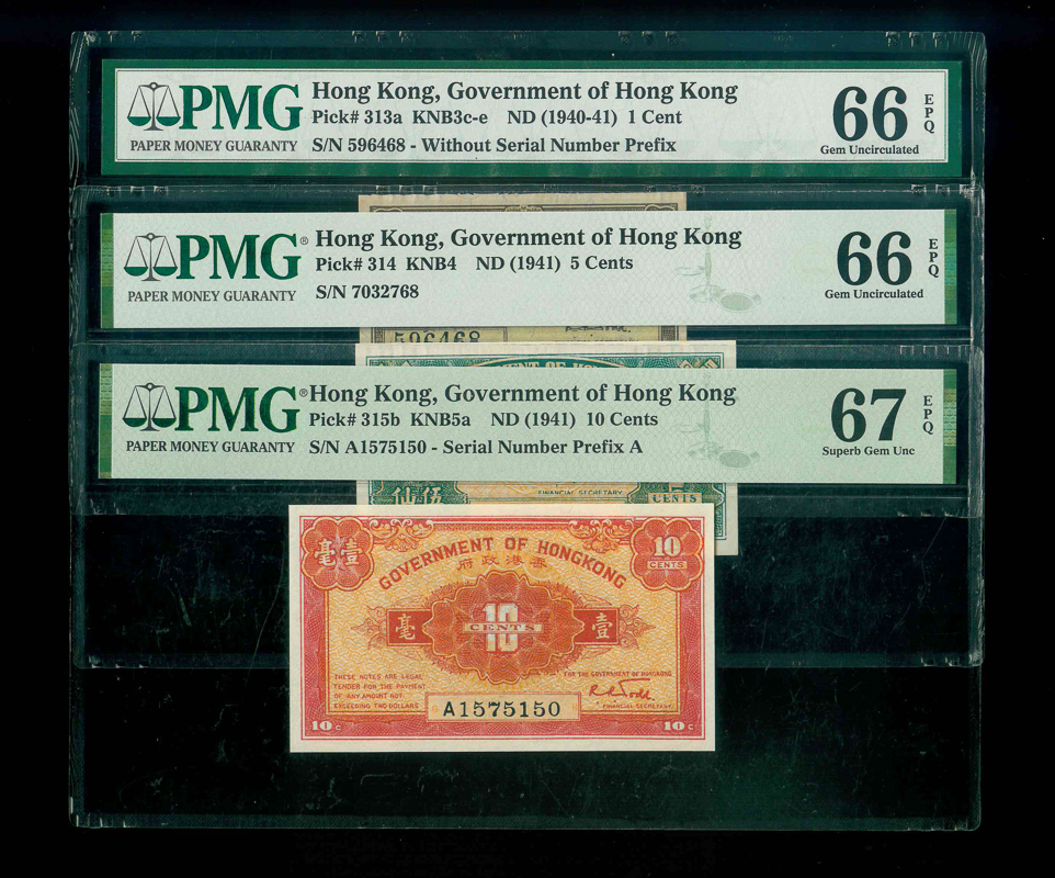 1940-41ND. 香港政府 壹仙-壹毫 PMG 66-67 EPQ 編號: A1575150…, 共3張
