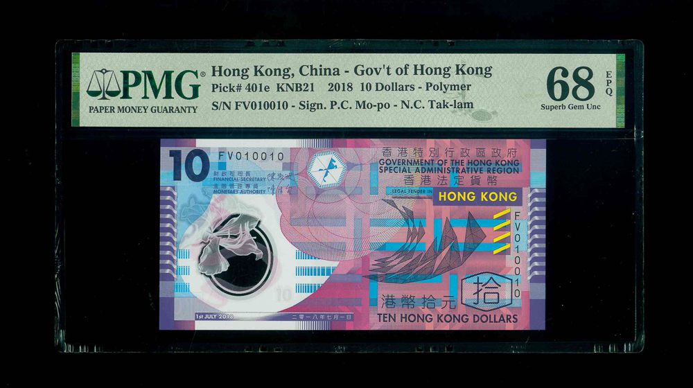 2018 香港政府$10 PMG 68 EPQ 編號: FV010010, 罕有高分四標