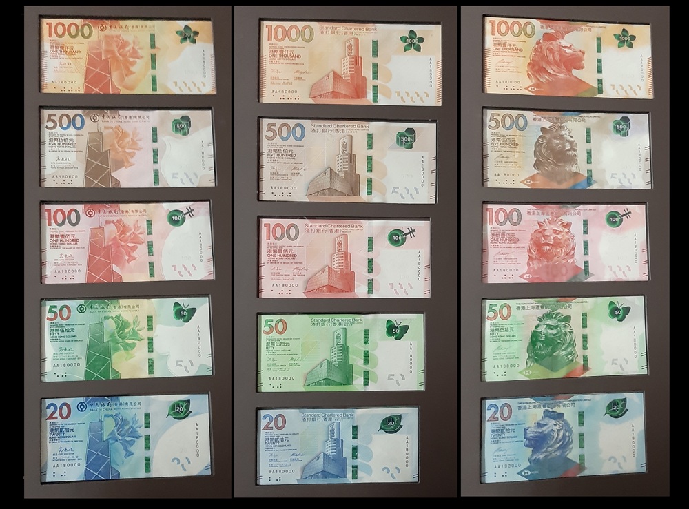 2018 香港中國/匯豐/渣打銀行$20-$1000-三行同號大全套 UNC 編號: AA180000, 共15張