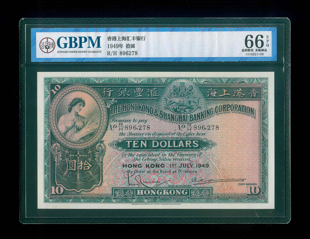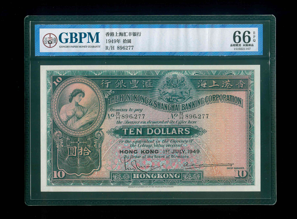 1949 香港上海匯豐銀行$10 GBPM 66 EPQ 編號: R/H 896277