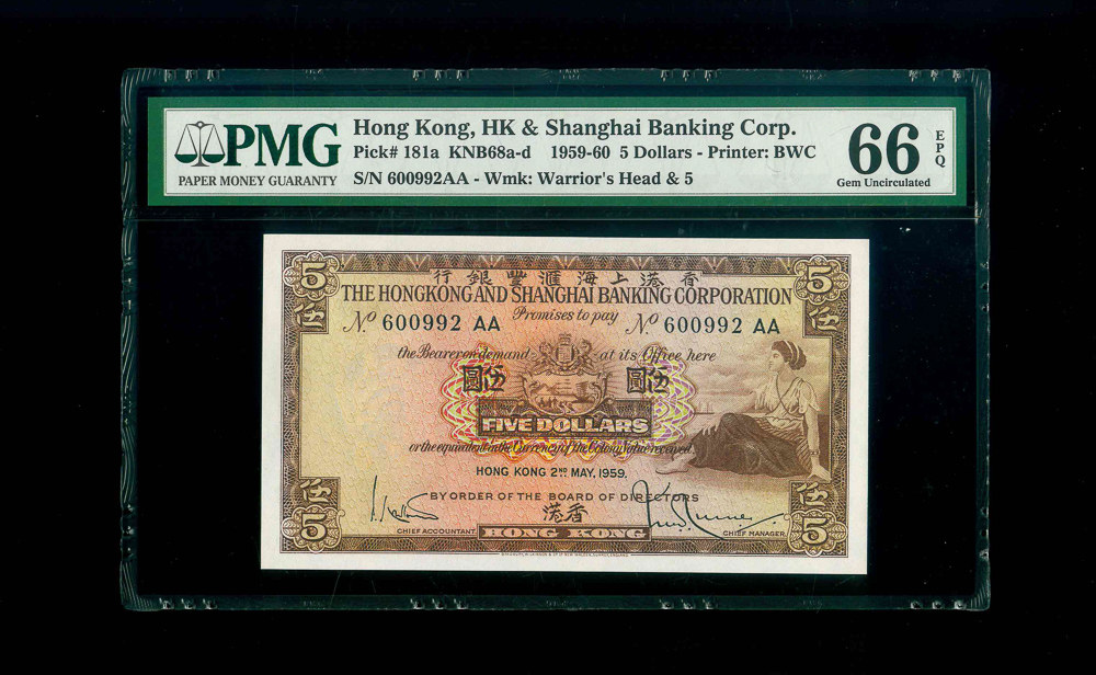 1959 香港上海匯豐銀行$5 PMG 66 EPQ 編號: 600992AA, 頭版系列