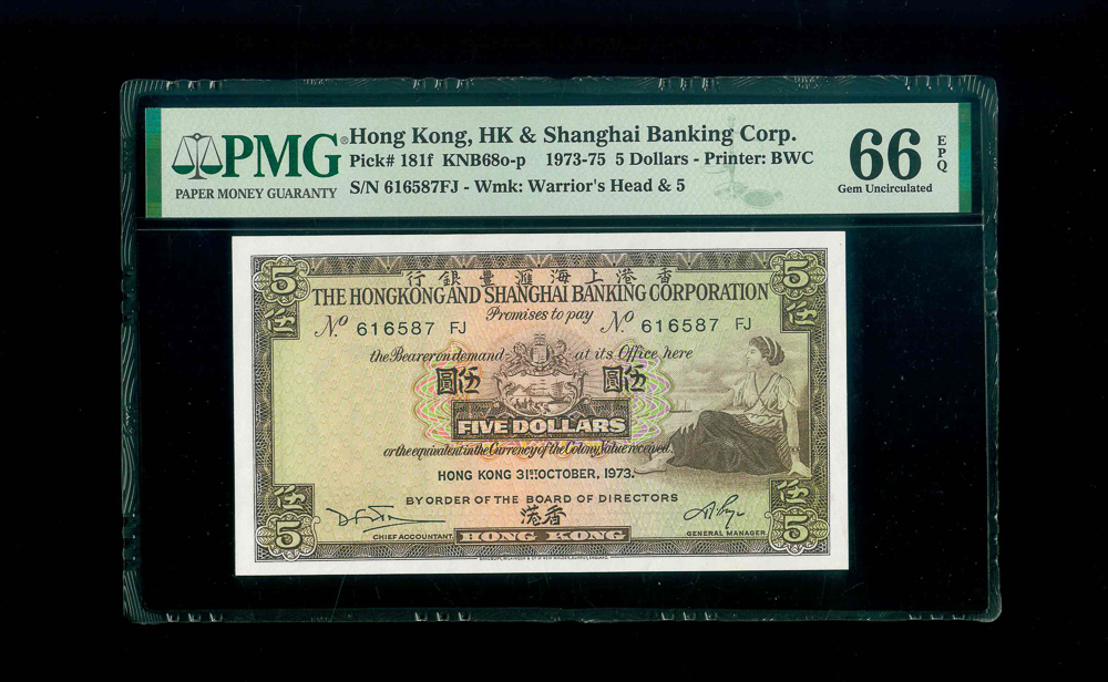 1973 香港上海匯豐銀行$5 PMG 66 EPQ 編號: 616587FJ, 印刷錯體