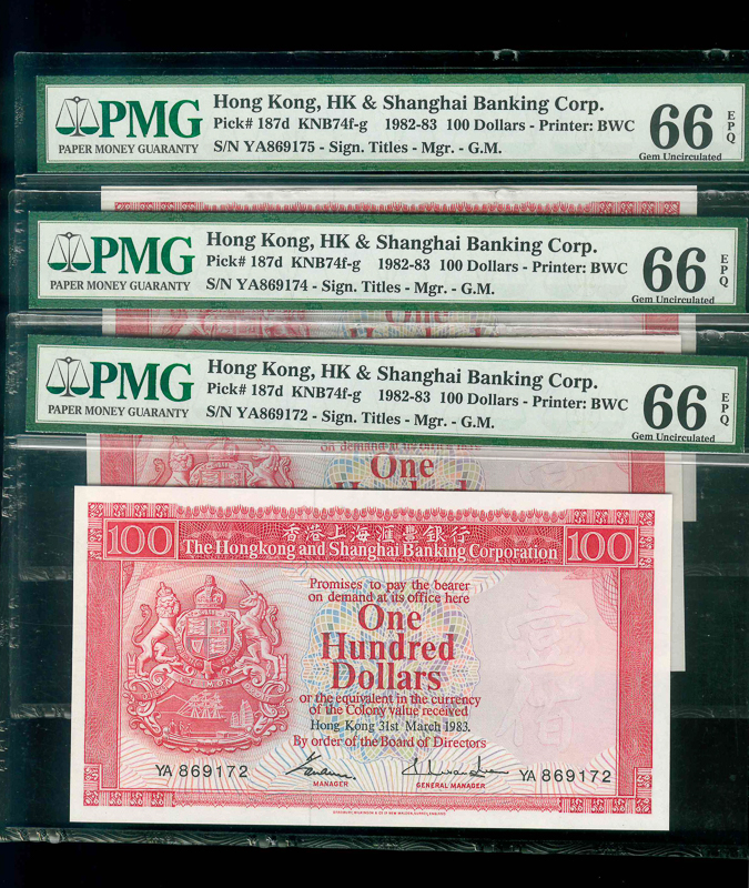 1983 香港上海匯豐銀行$100 PMG 66 EPQ 編號: YA869172/ 174/ 175, 含連號, 共3張