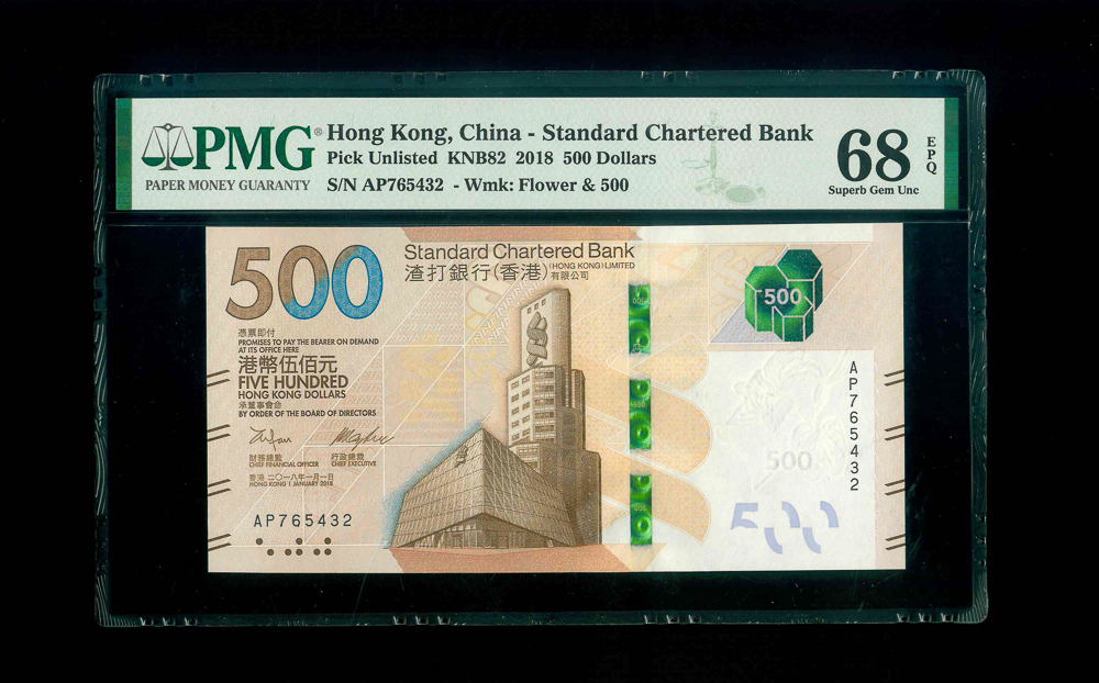 2018 香港渣打銀行$500 PMG 68 EPQ 編號: AP765432, 高分倒蛇