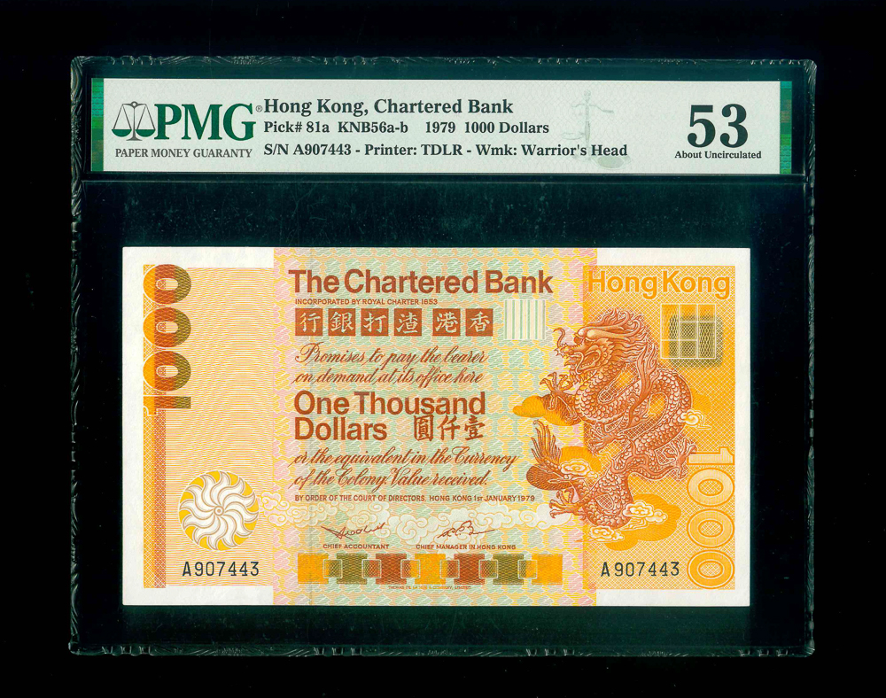 1979 香港渣打銀行$1000 PMG 53 編號: A907443, 頭版系列