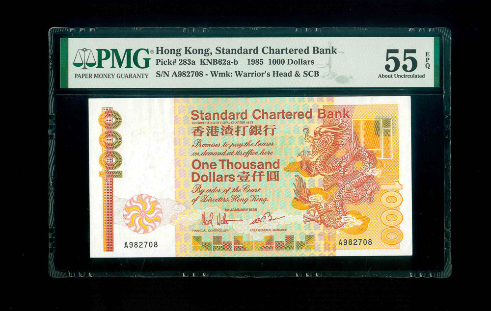 1985 香港渣打銀行$1000 PMG 55 EPQ 編號: A982708, 頭版系列