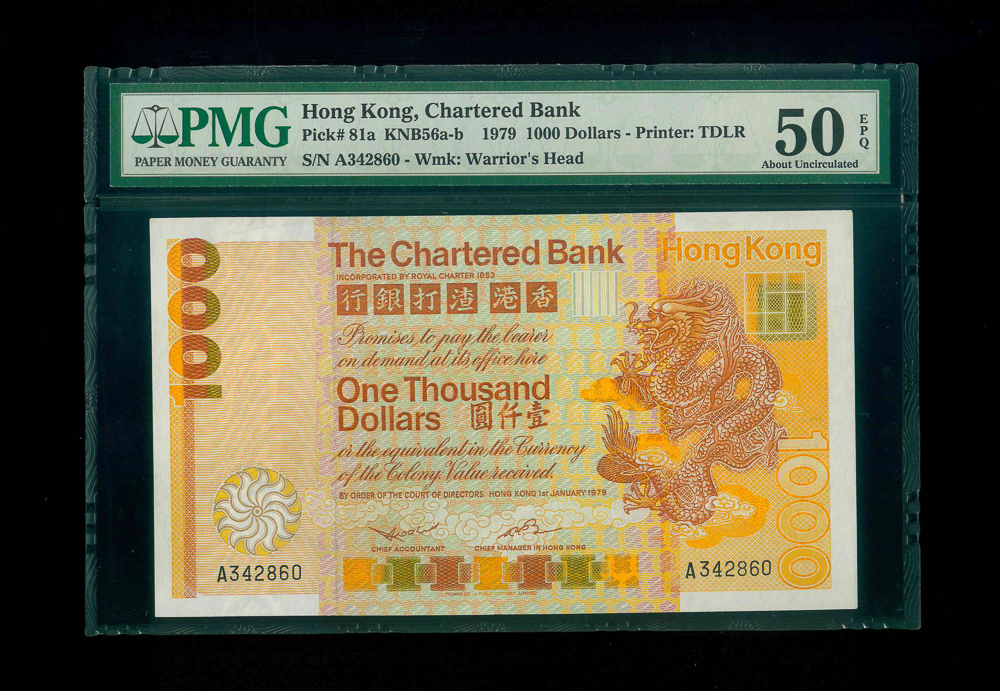 1979 香港渣打銀行$1000 PMG 50 EPQ 編號: A342860, 頭版系列