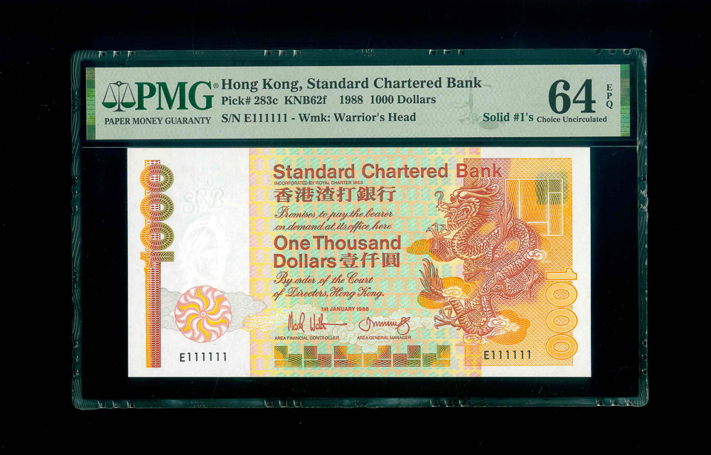 1988 香港渣打銀行$1000 PMG 64 EPQ 編號: E111111, 全1