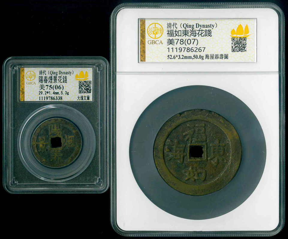 清代 陽春煙景花錢-大塊文章/ 福如東海花錢-海屋添壽圖 GBCA 美75(06)/ 美78(07), 共2枚