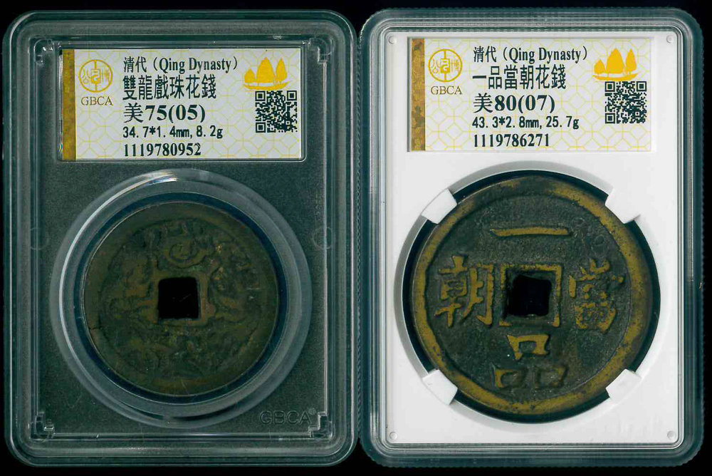 清代 雙龍戲珠花錢/ 一品當朝花錢 GBCA 美75(05)/ 美80(07), 共2枚