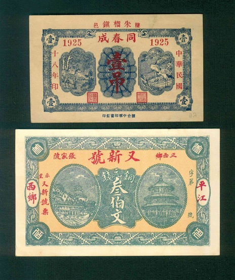 1925 中華民國18年印棲邑朱榴鎮同春成 壹吊/ 正西鄉張家陂又新號 銅元錢叁伯文 AU 編號: NIL(共2張,錢庄票)