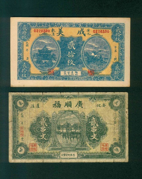 民國 安化敷溪成美 20枚/ 崖溪廣順福 2串文 Fine-AU 編號: 0270390…(共2張,錢庄票)