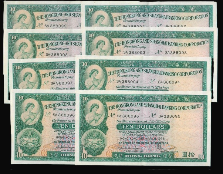 1978 香港上海滙豐銀行 $10 AU 編號: SA 388092-099(共8張,連號)