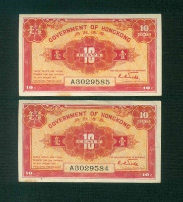 1941 香港政府 壹毫 AU 編號: A3029584-85(共2張,連號)