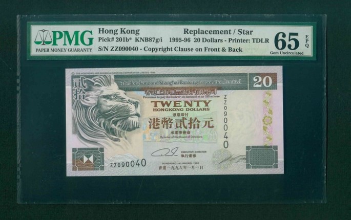 1996 香港上海滙豐銀行 $20 PMG 65 EPQ 編號: ZZ090040(補版系列,頂級雪白)