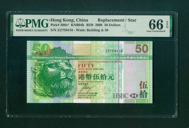 2008 香港上海滙豐銀行 $50 PMG 66 EPQ 編號: ZZ758416(補版系列,頂級雪白)