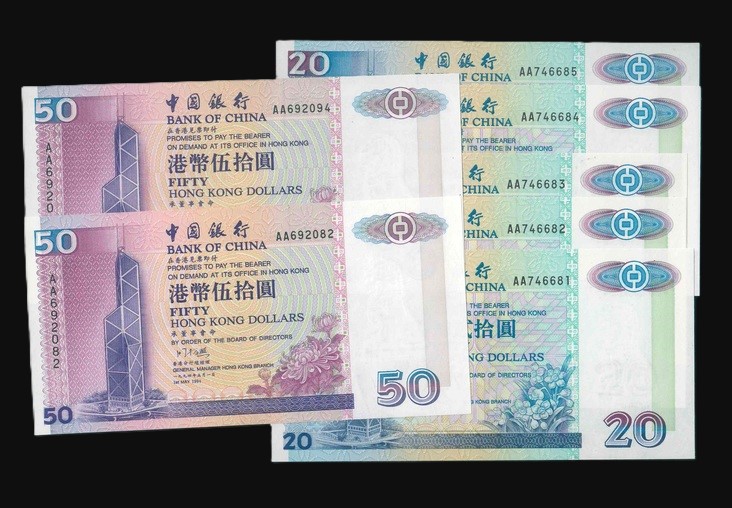 1994 中國銀行 $20x5 $50x2 UNC 編號: AA746681-85,AA692082…(共7張,頭版含連號)