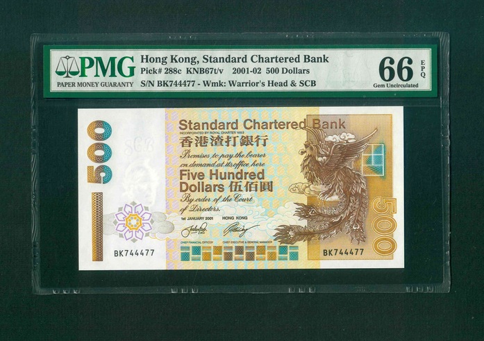 2001 香港渣打銀行 $500 PMG 66 EPQ 編號: BK744477(頂級雪白)