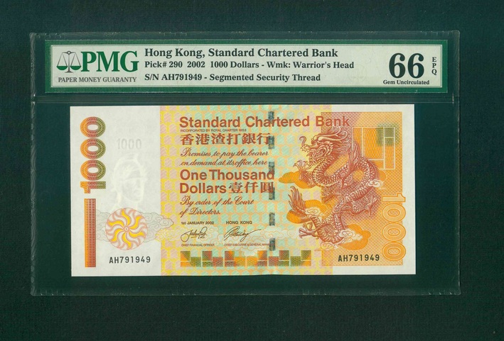 2002 香港渣打銀行 $1000 PMG 66 EPQ 編號: AH791949(頂級雪白)
