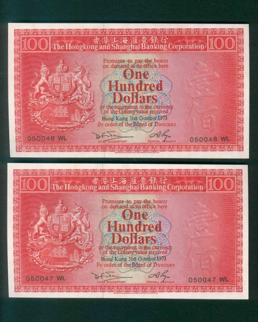 1973 香港上海滙豐銀行 $100 AU 編號: O50047-48 WL(共2張,連號,頂級雪白)
