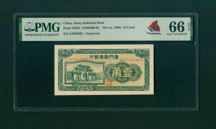 1940 廈門勸業銀行 壹角 PMG 66 EPQ 編號: A365046C(頂級雪白)