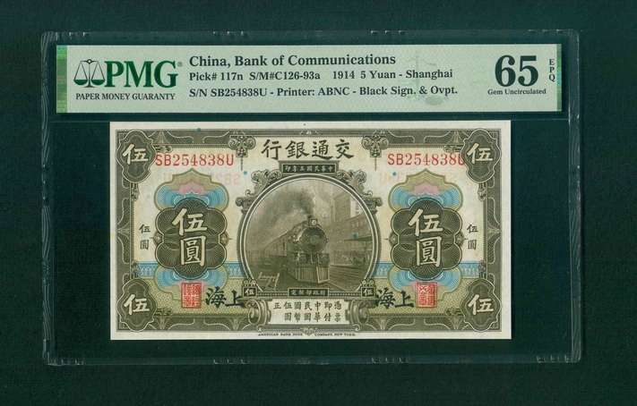 1914 上海交通銀行 $5 PMG 65 EPQ 編號: SB254838U(頂級雪白)