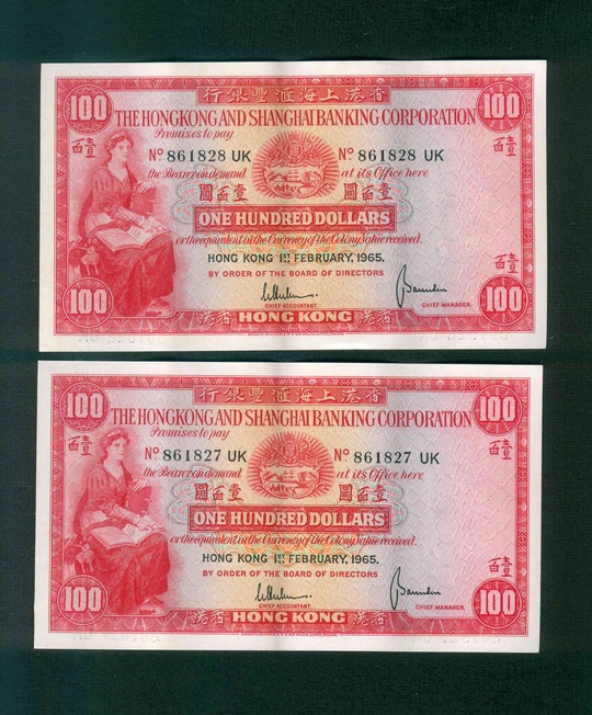 1965 香港上海滙豐銀行 $100 EF+ 編號: 861827-28 UK(共2張,連號)
