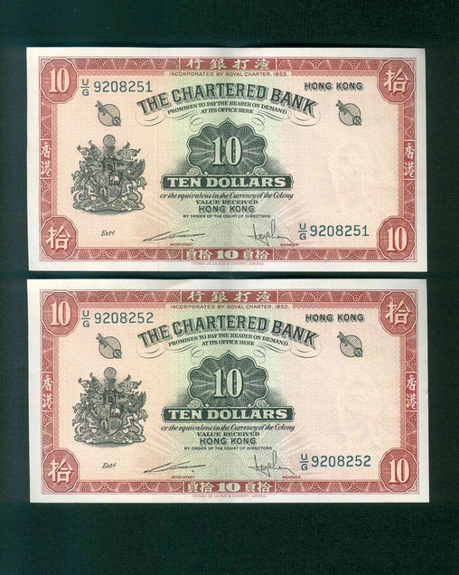 1962-70ND 香港渣打銀行 $10 AU 編號: U/G 9208251-52(共2張,連號)