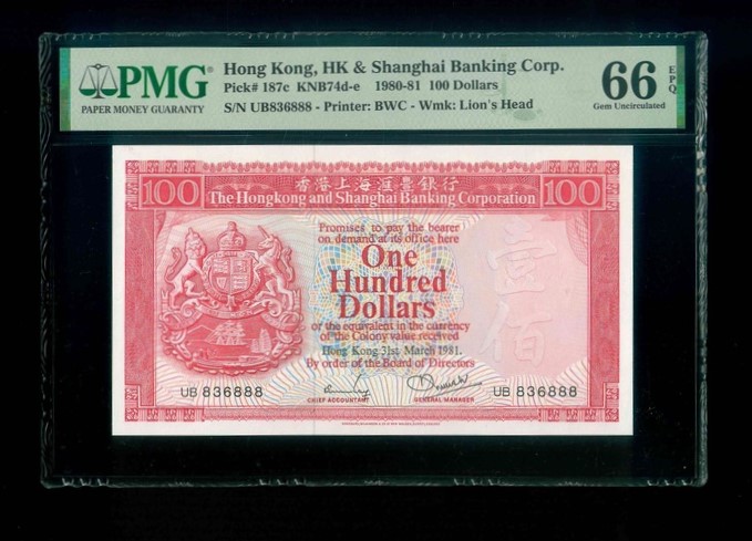1981 香港上海滙豐銀行 $100 PMG 66 EPQ 編號:UB 836888(豹子號,頂級雪白)