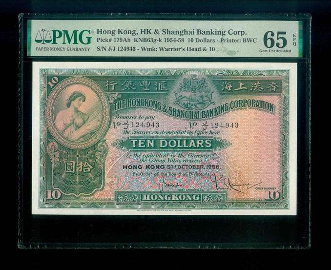 1956 香港上海滙豐銀行 $10 PMG 65 EPQ 編號:J/J 124943(頂級雪白)