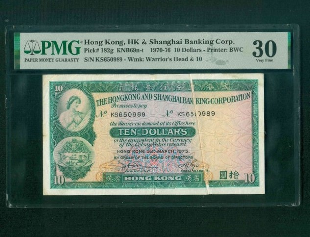 1975 香港上海滙豐銀行 $10 PMG 30 編號: KS650989(Gutter Fold Error)