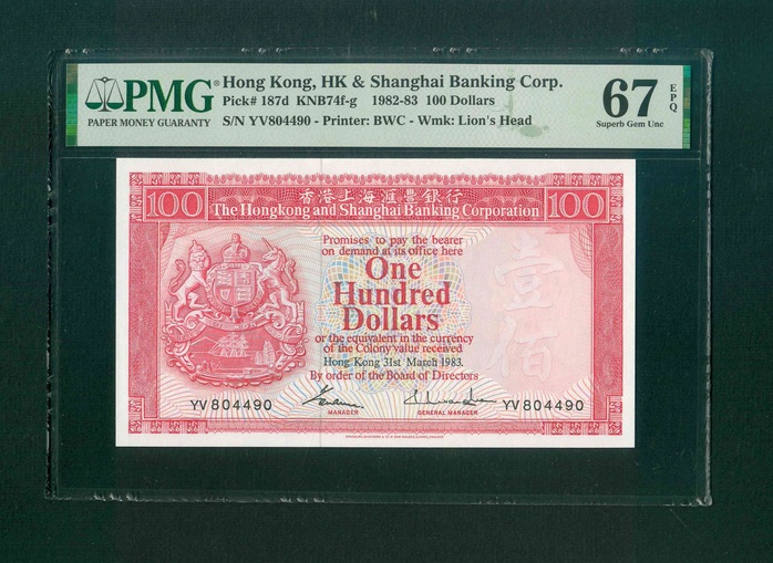 1983 香港上海滙豐銀行 $100 PMG 67 EPQ 編號:YV 804490(頂級雪白)