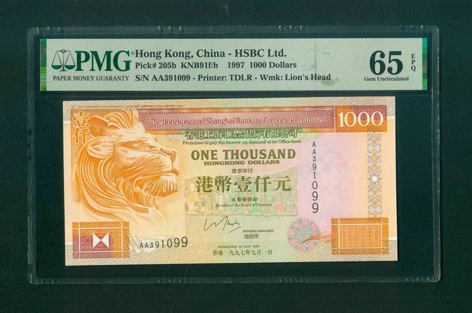 1997 香港上海滙豐銀行 $1000 PMG 65 EPQ 編號:AA391099(頭版系列,頂級雪白)
