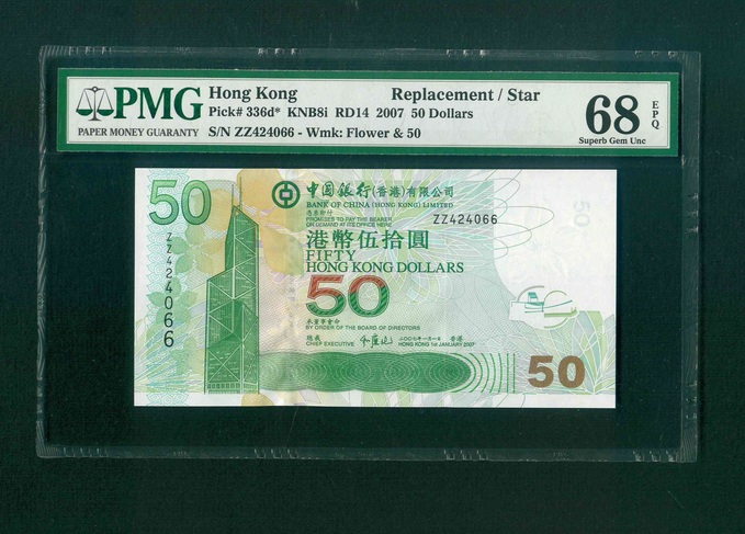 2007 香港中國銀行 $50 PMG 68 EPQ 編號:ZZ424066(補版系列,頂級雪白)