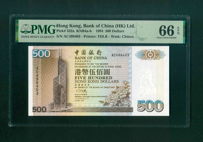 1994 中國銀行 $500 PMG 66 EPQ 編號:AC498403(頂級雪白)