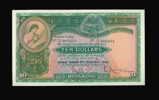 1959 香港上海滙豐銀行 $10 AU 編號:Y/J 396253