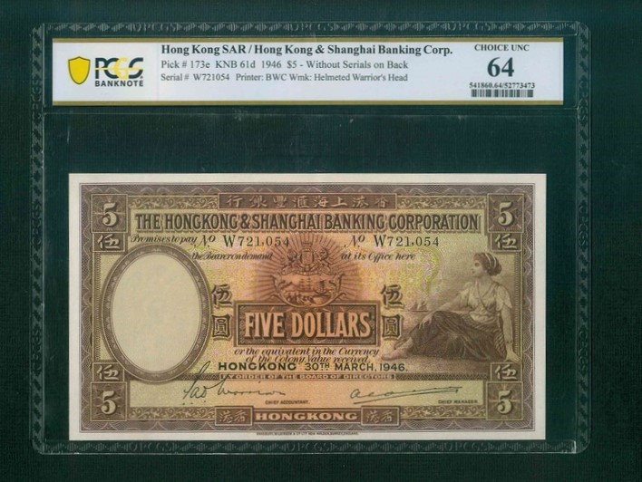 1946 香港上海滙豐銀行 $5 PCGS 64 編號:W721054