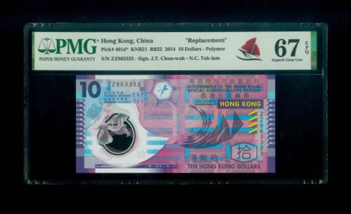 2014 香港特區政府 $10 PMG 67 EPQ 編號:ZZ863333(補版獅子號,頂級雪白)